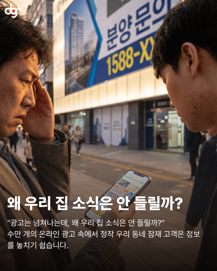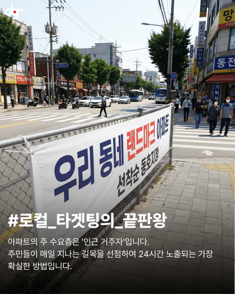 아파트 분양 홍보의 첫 번째 원칙은 ‘지역 밀착’입니다. 아파트의 주 수요층은 해당 지역 인근 거주자일 확률이 70% 이상입니다. 이들은 매일 출퇴근하며 지나는 길목에서 정보를 얻습니다. 온라인 광고는 타겟 설정이 광범위할 수 있지만, 현장의 대형 현수막 제작물은 실제 거주 가능성이 높은 잠재 고객의 시야를 24시간 점유합니다. “우리 동네에 새로운 랜드마크가 생긴다”는 인식을 심어주는 것이 모든 분양 마케팅 전략의 시작입니다.
