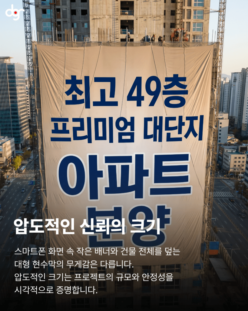 고객이 수억 원대의 자산을 결정할 때 가장 중요하게 생각하는 것은 ‘신뢰’입니다. 건물 전체를 압도하는 대형 현수막 제작은 프로젝트의 규모감과 안정성을 시각적으로 즉각 증명합니다. 작은 모바일 배너와 달리, 웅장한 실사 출력물은 브랜드의 위상을 높여주며 고객에게 “이곳은 믿을 만한 현장이다”라는 강력한 심리적 확신을 줍니다. 따라서 아파트 분양 홍보 과정에서 고퀄리티의 현수막 시공은 단순한 광고를 넘어 브랜드의 품격을 결정짓는 요소입니다.