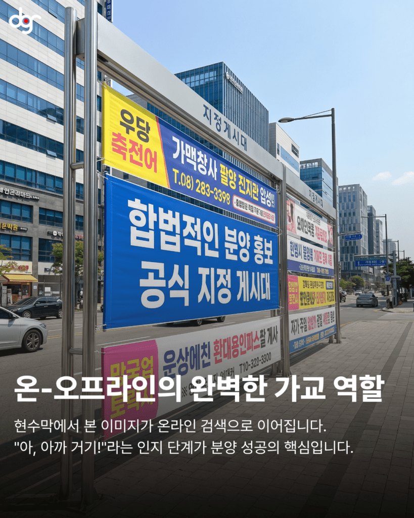효율적인 분양 마케팅 전략은 온-오프라인의 시너지를 극대화하는 것입니다. 거리에서 대형 현수막 제작물을 보고 호기심을 느낀 고객이 스마트폰으로 검색을 시작할 때, 이미 오프라인에서 형성된 신뢰도는 전환율을 비약적으로 상승시킵니다. 인지(현수막) -> 검색(온라인) -> 방문(모델하우스)으로 이어지는 매끄러운 고객 여정을 설계하는 것이 아파트 분양 홍보의 핵심 성공 공식입니다.