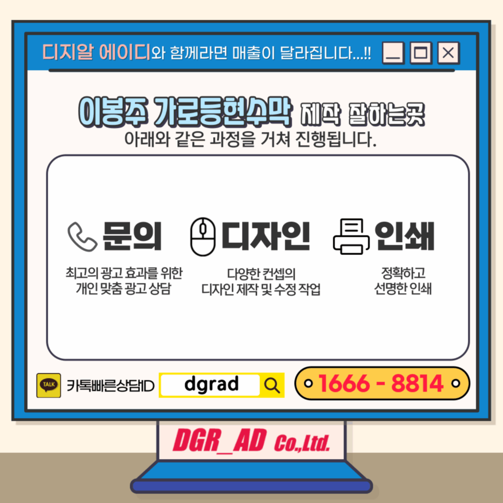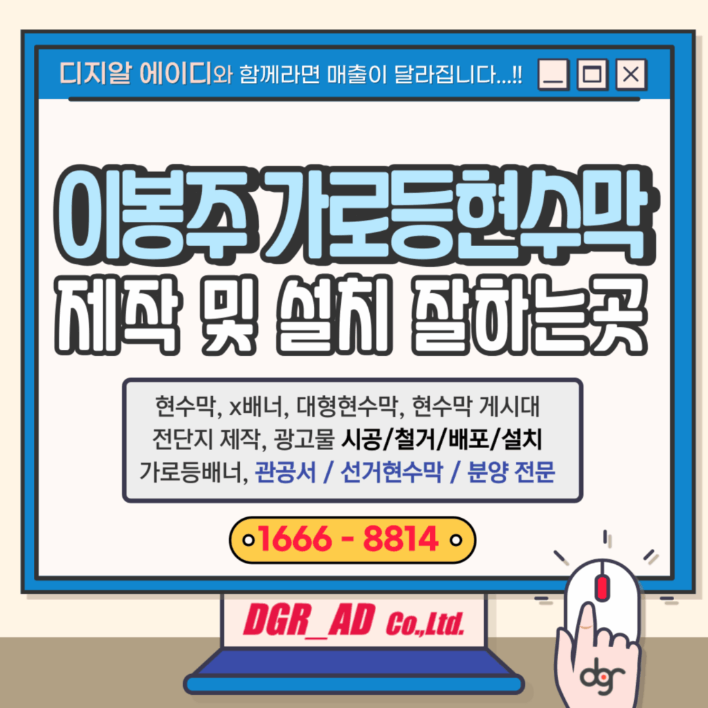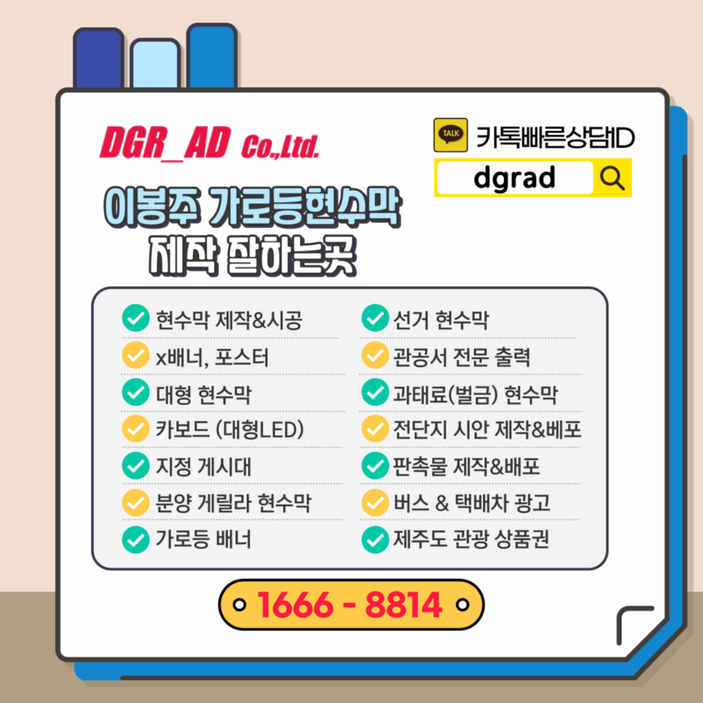 이번 ‘이봉주 재활 가로등현수막’처럼, 가로등 현수막 제작은 디자인부터 인쇄, 납품, 그리고 전문적인 ‘시공’까지 한 번에 이뤄져야 합니다. 디지알에이디는 홍보 효과와 확실한 설치, 이 두 마리 토끼를 잡을 수 있도록 기업이든 개인이든, 모든 과정을 처음부터 끝까지 원스톱으로 책임지고 진행합니다.