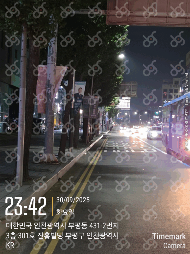 자, 지금부터는 실제 시공 현장입니다. 2025년 9월 30일 화요일, 밤 23시 57분. 이곳은 인천광역시 부평구 부평동 465-1입니다. 시민들의 통행이 뜸한 늦은 밤, 디지알에이디의 전문 시공팀이 안전하고 신속하게 작업을 진행합니다. ‘근로복지공단 인천병원’ 현수막과 나란히, ‘이봉주 문화강연’ 현수막이 깔끔하게 설치되었습니다.