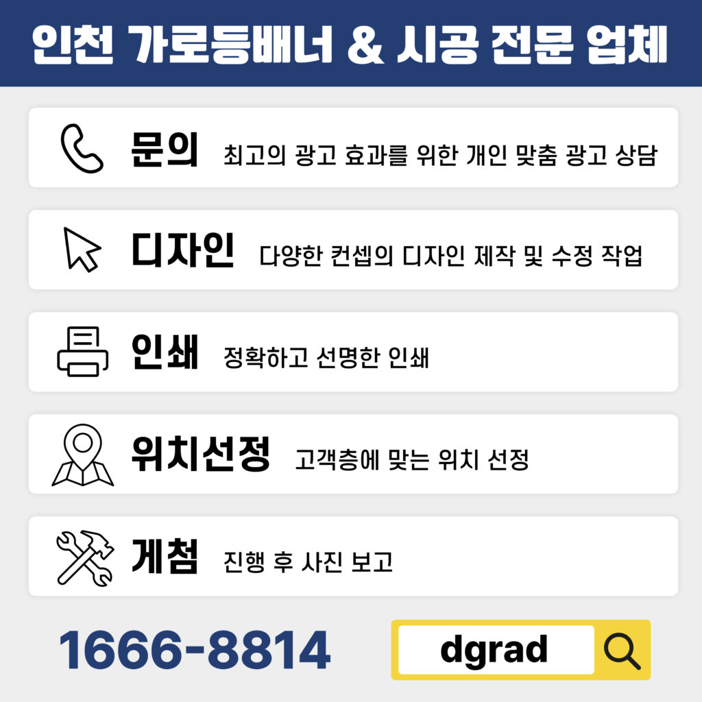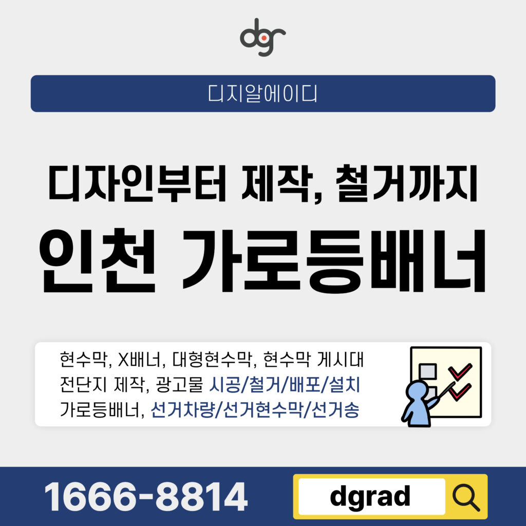 디지알에이디는 인천 가로등배너에 대한 제작뿐만 아니라 행정 절차, 설치 조건 등 전반적인 과정을 지원합니다.