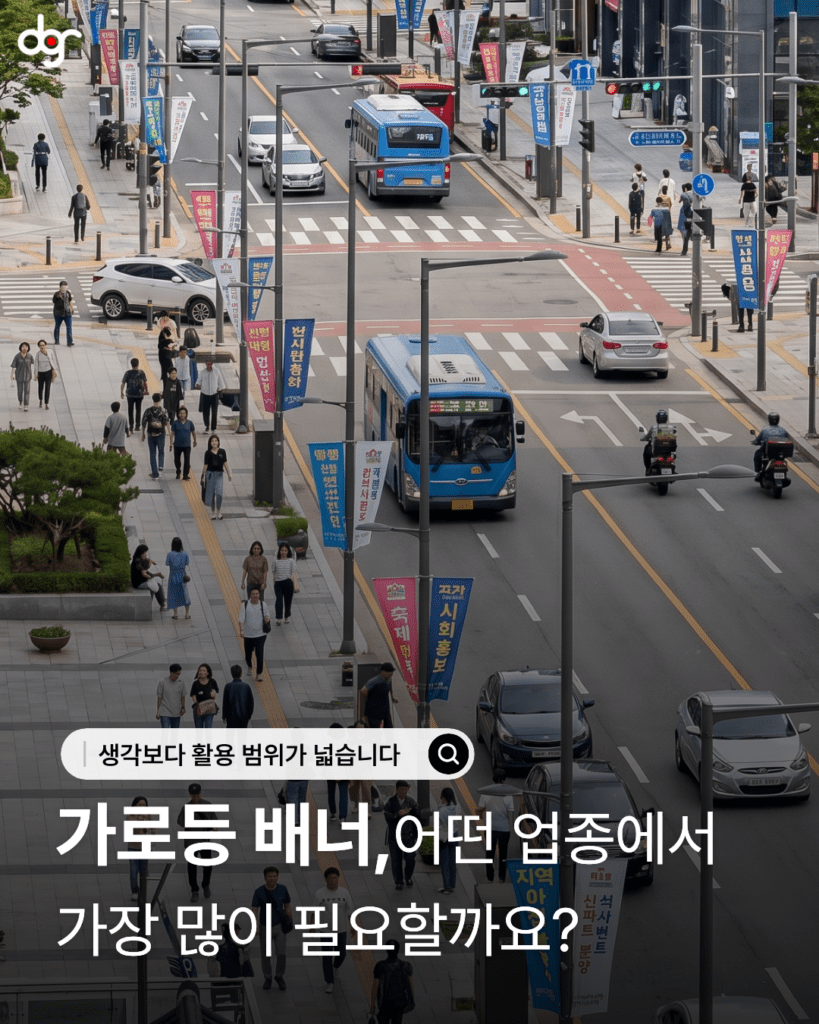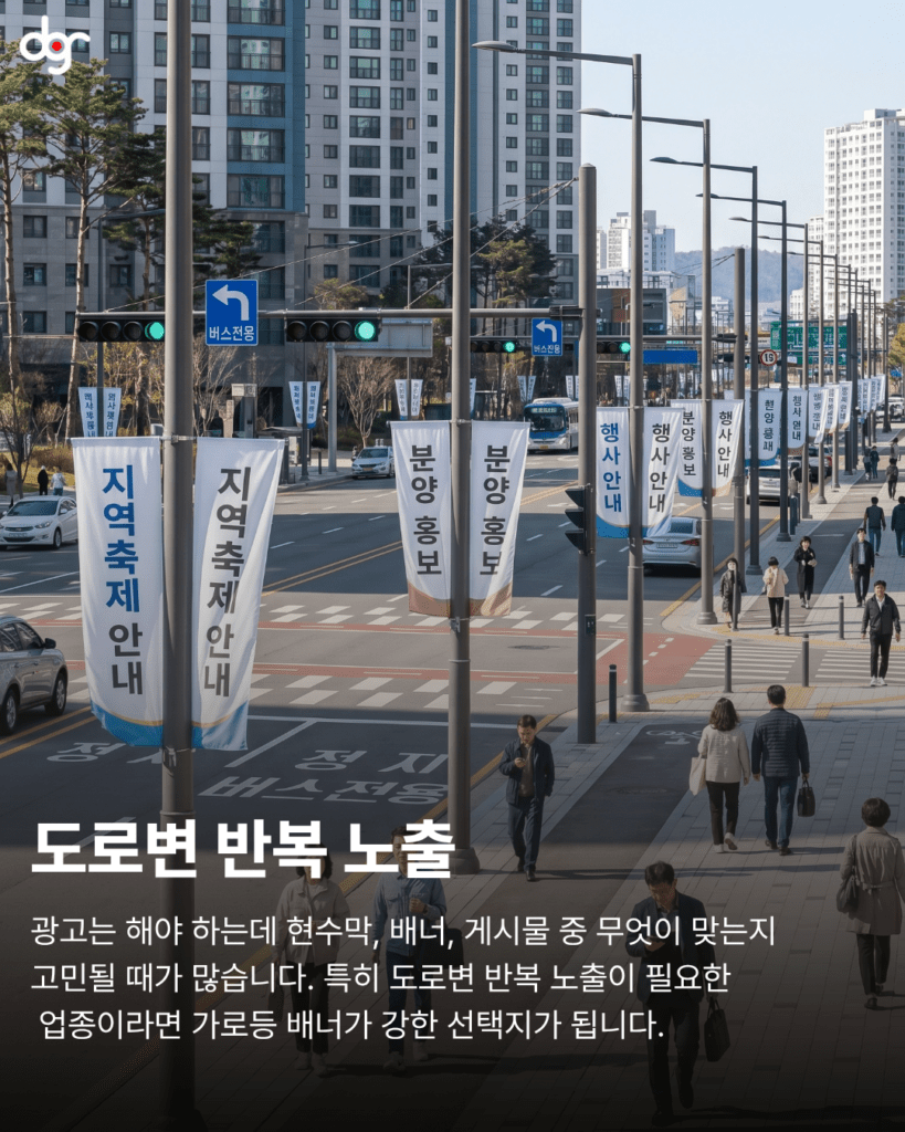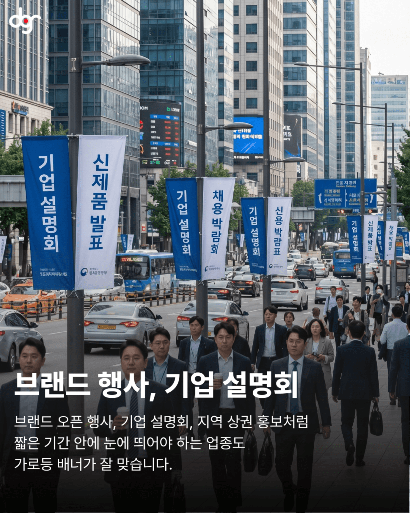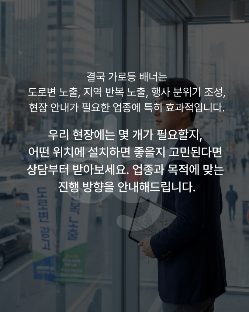 또한 소상공인 매장이나 신규 오픈 매장의 경우, 가로등 배너를 활용하면 주변 상권에 빠르게 존재를 알릴 수 있습니다. 단순히 한 번 보는 광고가 아니라, 매일 반복적으로 노출되기 때문에 고객의 기억에 자연스럽게 남게 됩니다.
