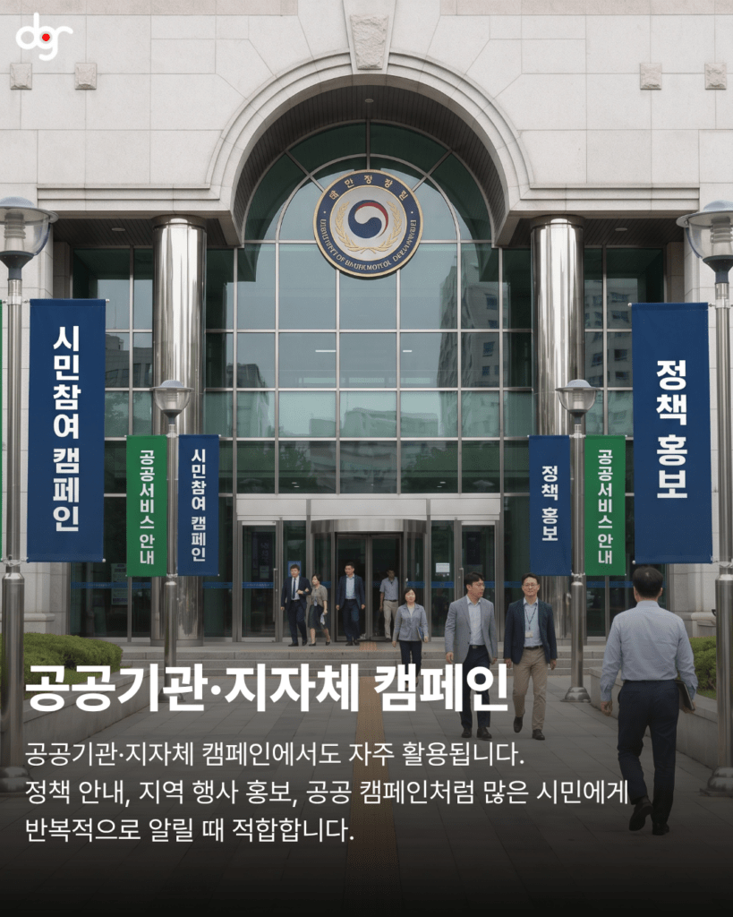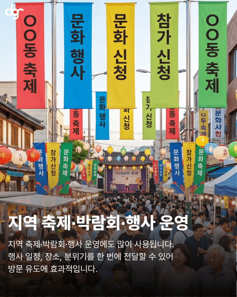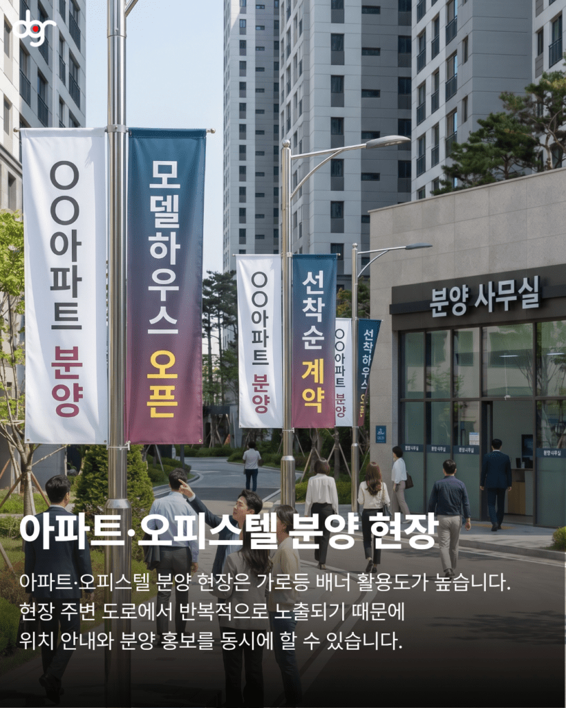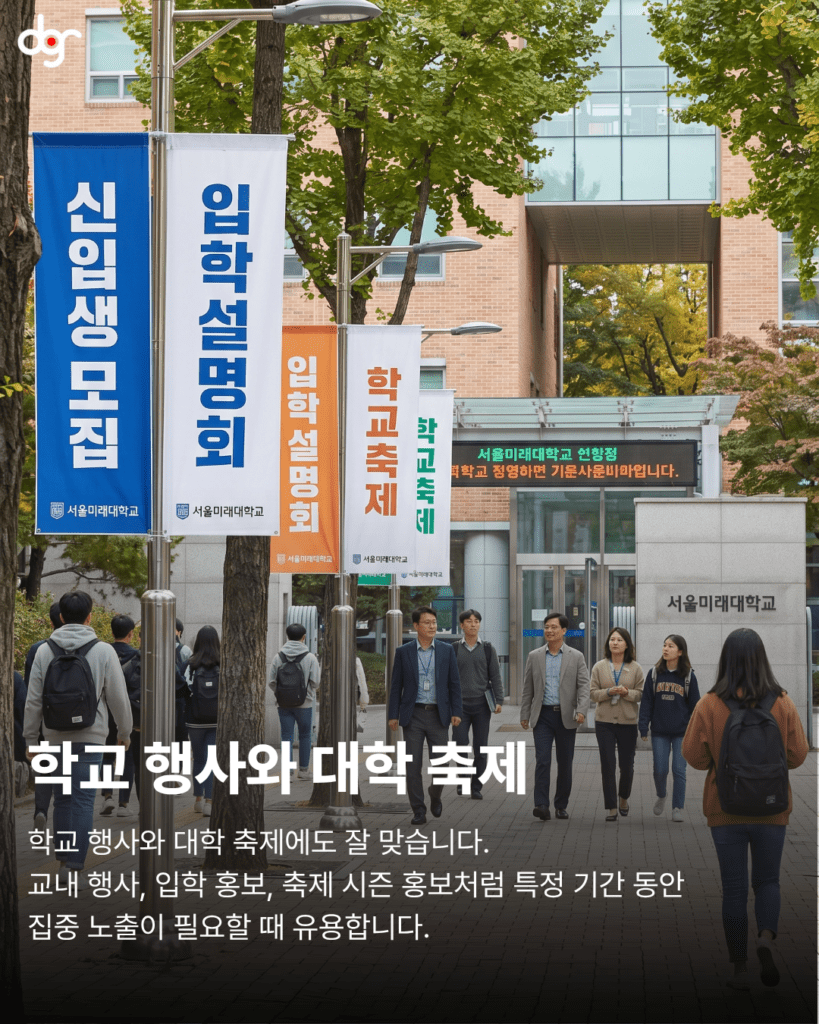 또한 소상공인 매장이나 신규 오픈 매장의 경우, 가로등 배너를 활용하면 주변 상권에 빠르게 존재를 알릴 수 있습니다. 단순히 한 번 보는 광고가 아니라, 매일 반복적으로 노출되기 때문에 고객의 기억에 자연스럽게 남게 됩니다.