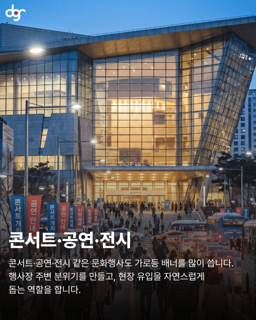 가로등 배너는 짧은 시간 안에 많은 사람들에게 메시지를 전달할 수 있는 대표적인 옥외광고 수단입니다. 특히 유동인구가 많은 도로와 주요 동선에 설치되는 가로등 배너는 반복 노출을 통해 자연스럽게 브랜드 인지도를 높이는 데 큰 역할을 합니다.